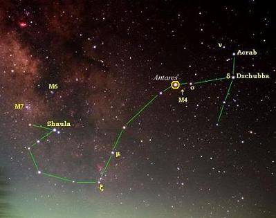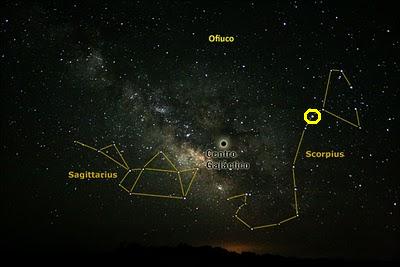 Aquí se observa cómo la constelación de Escorpio -remarcada en blanco- impide a la de Ophiuco -señalada en azul mar- acercarse a la Tierra (la zona en verde).