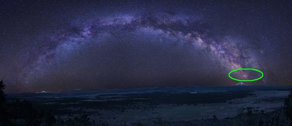 La Vía Láctea y la zona del centro galáctico, señalada en verde.