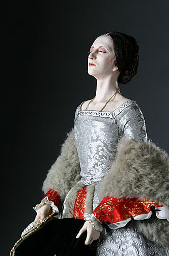 Llevaba puesta «una enagua roja bajo un vestido gris oscuro de damasco, adornado con pieles»
